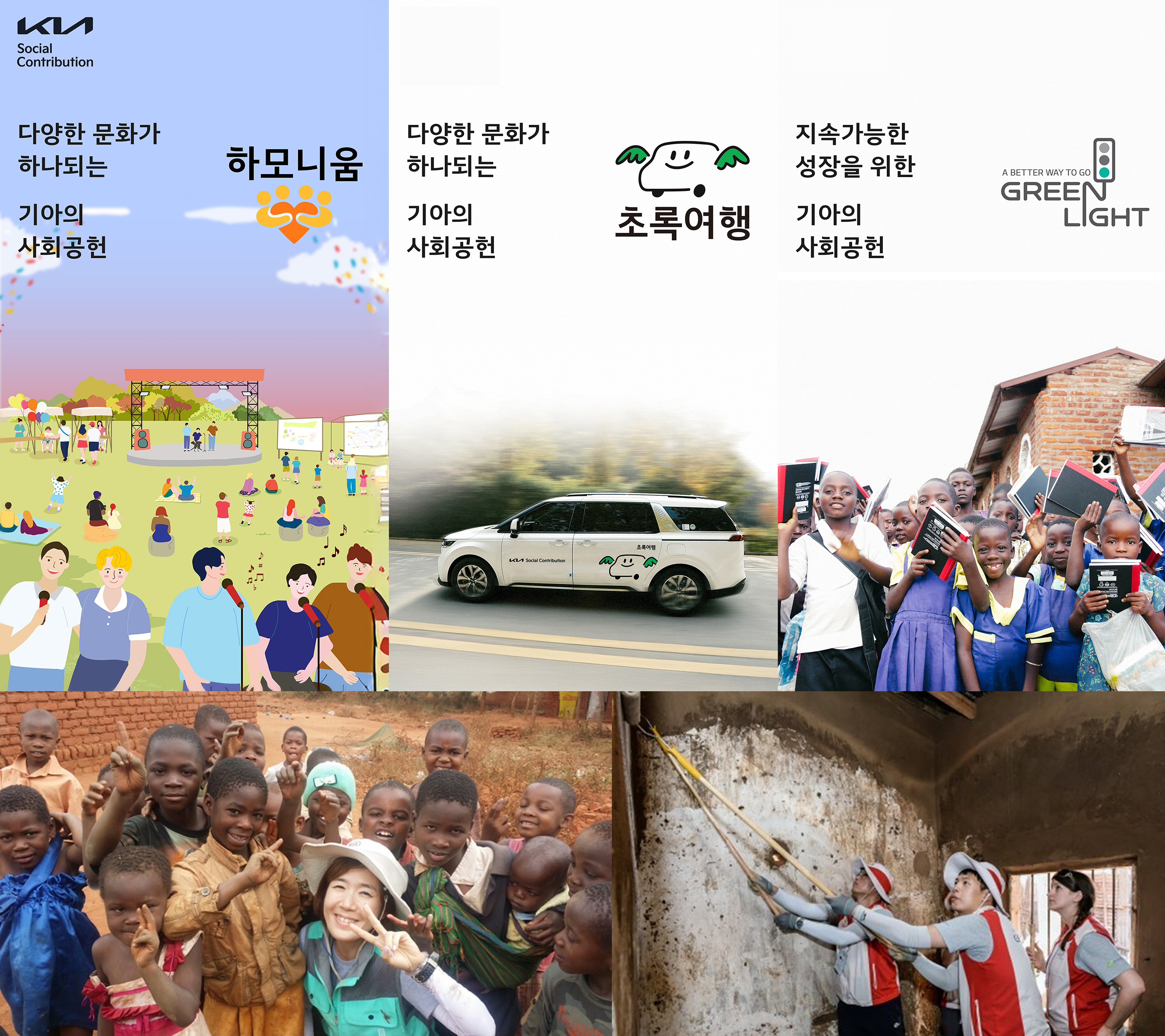 기아는 그동안 다양한 영역에서 사회공헌사업을 이어왔다. 기아 글로벌 임직원 봉사활동에 참여한 지속가능경영팀 이은주 팀장(왼쪽 아래)과 하모니움 사업 담당자 노현태 책임매니저(오른쪽 아래)의 모습. /제공=기아