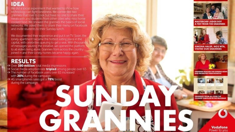 ‘Sunday Grannies’는 영국 최대 통신 기업 보다폰의 루마니아 지사에서 진행한 캠페인이다. 캠페인명은 우리나라말로 하면 ‘일요일 할머니들’이라는 뜻이다. 보다폰은 루마니아의 고립된 노인들이 외로움을 극복하도록 하는 사회 실험으로 요리하는 것을 좋아하는 할머니에게 집밥이 그리운 학생들을 모아서 다이닝을 열도록 했다. 할머니 두 명에게 페이스북을 맡기고 다이닝을 운영하도록 했는데 할머니가 음식 사진과 함께 ‘이번주 밥 먹으러 올 사람?’하고 올리면 학생들이 댓글을 다는 식이었다. 해당 캠페인 영상은 빠르게 퍼졌고 영상을 본 65세 이상의 사람들 사이에서 소셜미디어가 흥행했다. 캠페인 기간 동안 페이스북 유저가 20% 증가, 노인의 소셜미디어 적응률이 3배 가까이 늘었고, 4G 스마트폰 판매도 캠페인 기간 78%나 증가한 것으로 확인되었다. 캠페인을 통해 할머니들은 학생들과 오프라인에서 의미있는 관계를 형성하고 학생들과 교류하는 과정에서 디지털과 친해지는 효과를 얻었다. 이를 통해 보다폰은 브랜드를 효과적으로 알리고 서비스 판매 확대 효과도 얻을 수 있었다.