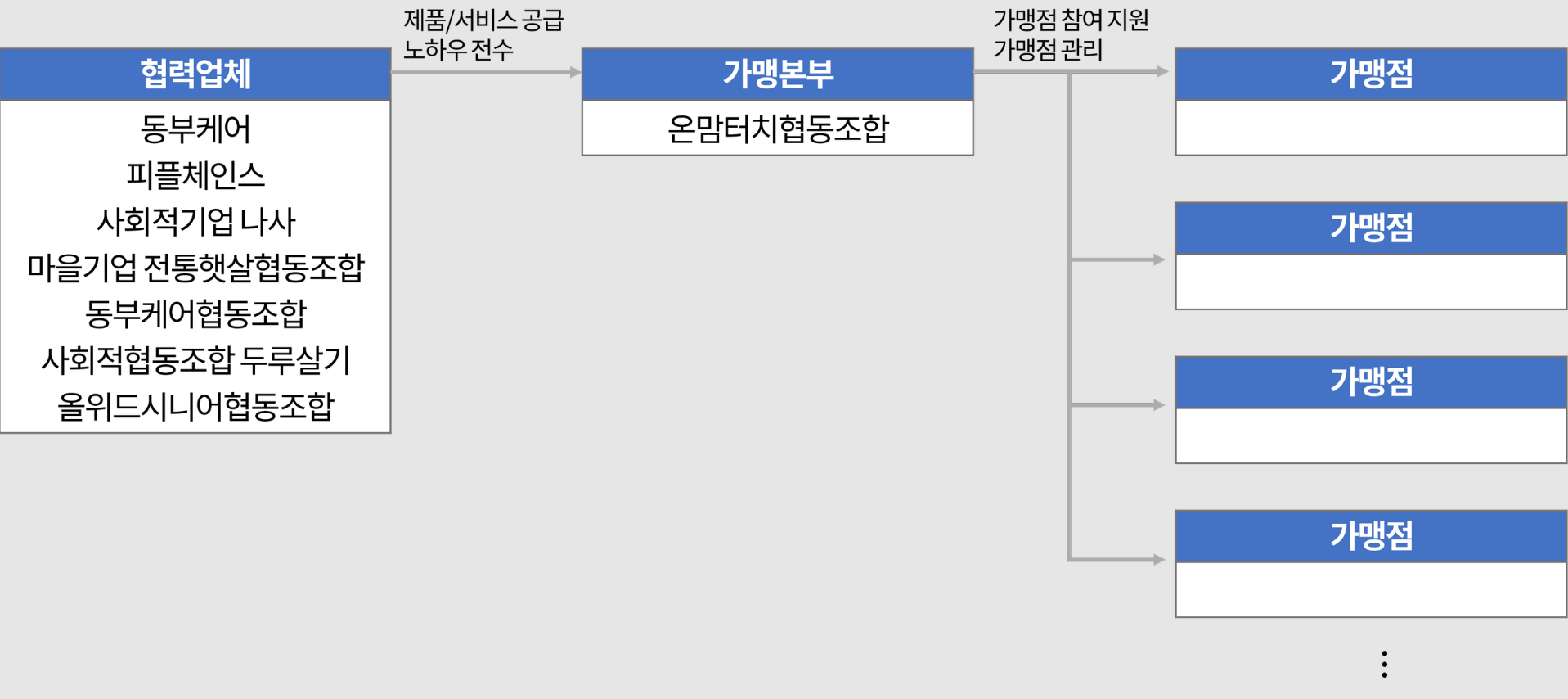 온맘터치 협동조합은 영세한 기존의 노인장기요양기관을 프랜차이즈화하여 표준화된 서비스를 제공, 전문화된 조직으로 성장할 수 있도록 지원하기 위해 설립되었다. 온맘터치 협동조합에는 노인장기요양분야 선도 기업인 동부케어 외 노인돌봄 전문 기관 6개사가 참여하고 있다.
