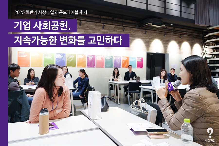 지난 11월 26일 세상파일은 다양한 기업/기관의 사회공헌 담당자분들과 한자리에 모여 한 걸음 더 나아간 사회공헌을 논의하는 자리로 2025 하반기 세상파일 라운드테이블 행사를 열었습니다. 지난 5월 상반기에 이어 ‘기업 사회공헌의 지속가능한 변화’를 주제로 좀 더 깊이 있는 두 번째 논의를 이어가 보았는데요.