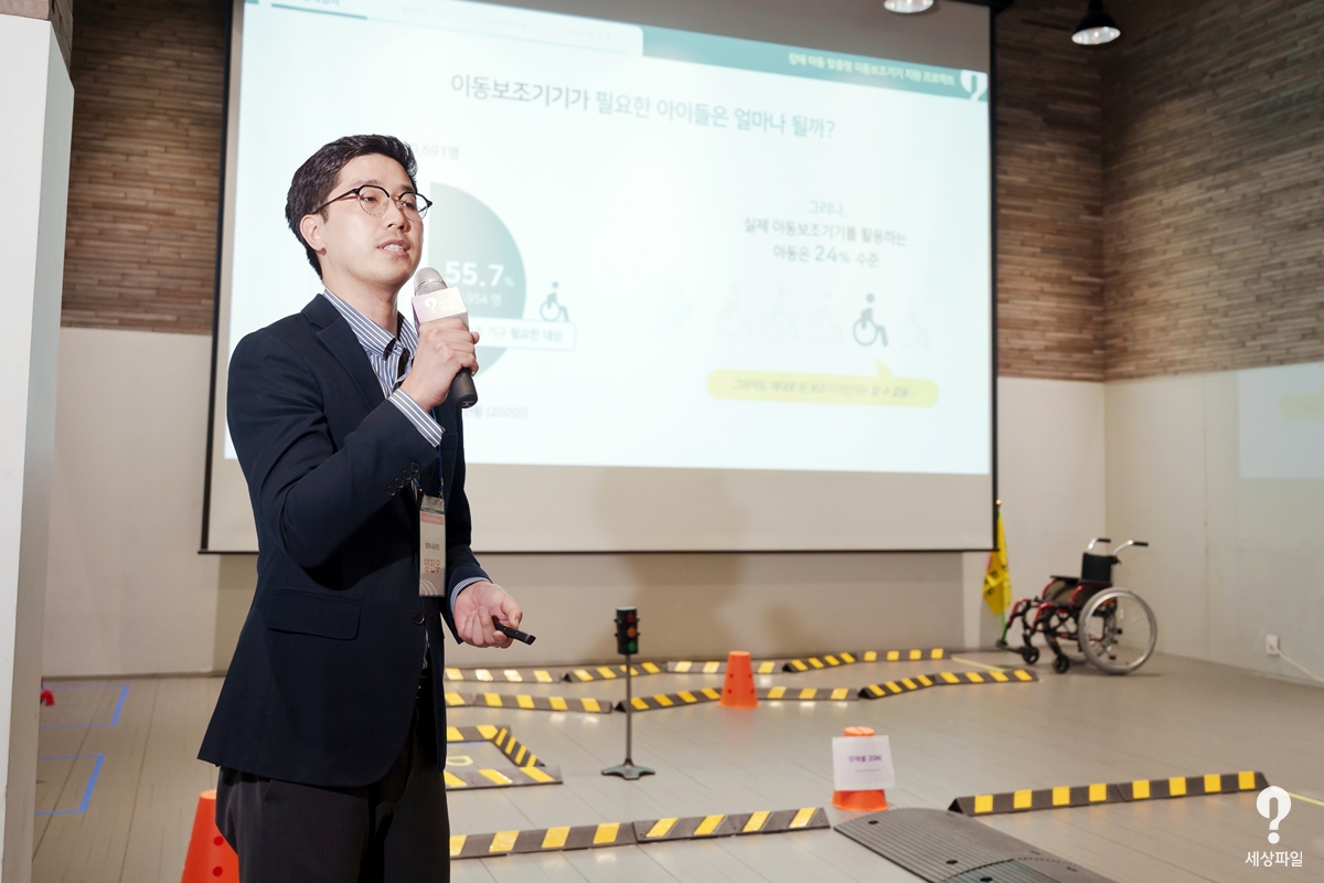 이어서 세상파일팀 양진우 매니저가 ‘장애 아동 맞춤형 이동보조기기 지원 프로젝트’ 사례를 발표했는데요. 해당 프로젝트는 휠체어를 사용하는 장애 아동이 스스로 자유롭게 이동할 수 있도록 아동의 몸에 맞는 수동 휠체어와 전동키트, 휠체어 안전 사용 교육을 솔루션으로 제공합니다. 전동키트란, 수동 휠체어에 장착하는 전기 장치로 수동휠체어의 가벼움을 유지하면서 전동 기능을 더해 이동 편의성을 획기적으로 향상시킨 보조기기인데요. 현재까지 전국의 6세~18세 아동 약 4,000명을 지원했으며, 아이들의 이동 독립성(13.5% > 93.5%)과 이동 경험(75.5% > 93.9%)이 증가하고 행복감과 자존감, 자아실현 욕구가 높아지는 등의 긍정적 변화를 확인한 바 있습니다.