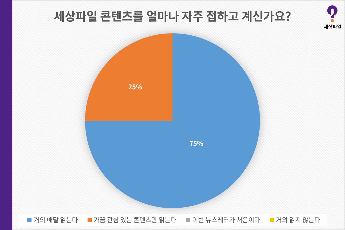 응답자의 무려 75%가 ‘거의 매달’ 세상파일의 콘텐츠를 정기적으로 읽고 있다고 응답한 건데요. 정보가 범람하여 주의력이 분산되는 디지털 시대에, 매달 꼬박꼬박 세상파일의 기록을 확인하고 정독한다는 것은 우리 콘텐츠가 그만큼 의미 있다는 뜻이겠죠?