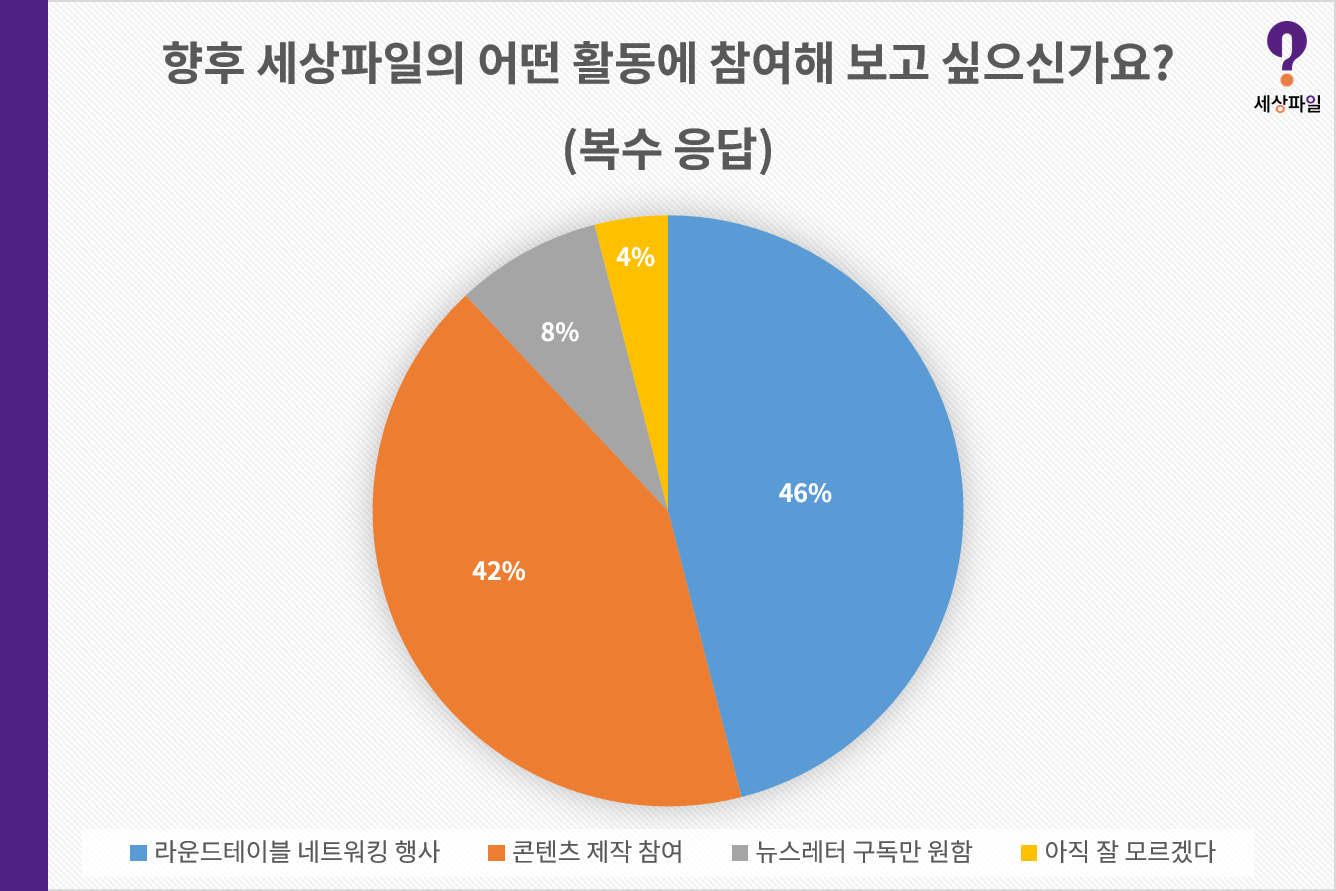 향후 참여하고 싶은 활동을 묻는 질문(복수 응답)에서 ‘라운드테이블 네트워킹 행사’가 46%라는 압도적인 수치를 기록했으며, ‘콘텐츠 제작 참여(인터뷰, 기고 등)’ 역시 42%라는 높은 수치를 기록했어요.