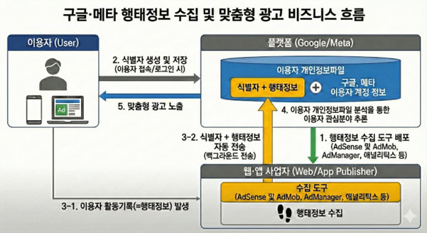 이용자가 웹·앱에서 활동하면 행태정보가 발생합니다. 온라인 쇼핑몰, 미디어 등을 웹이나 앱에서 운영하는 사업자(웹·앱 사업자)들은 자사 웹사이트 및 앱 이용자의 행태정보가 구글과 같은 광고 플랫폼에 수집되도록, 플랫폼이 배포한 행태정보 수집 도구를 사용합니다(자사 웹·앱에 개인정보 자동 수집 장치를 설치·운영하는 방법으로 직접 행태정보를 수집하여 처리하기도 합니다). 이 도구들은 온라인 식별자와 결합된 위 행태정보를 이용자의 기기에서 광고 플랫폼 서버로 전송합니다.
