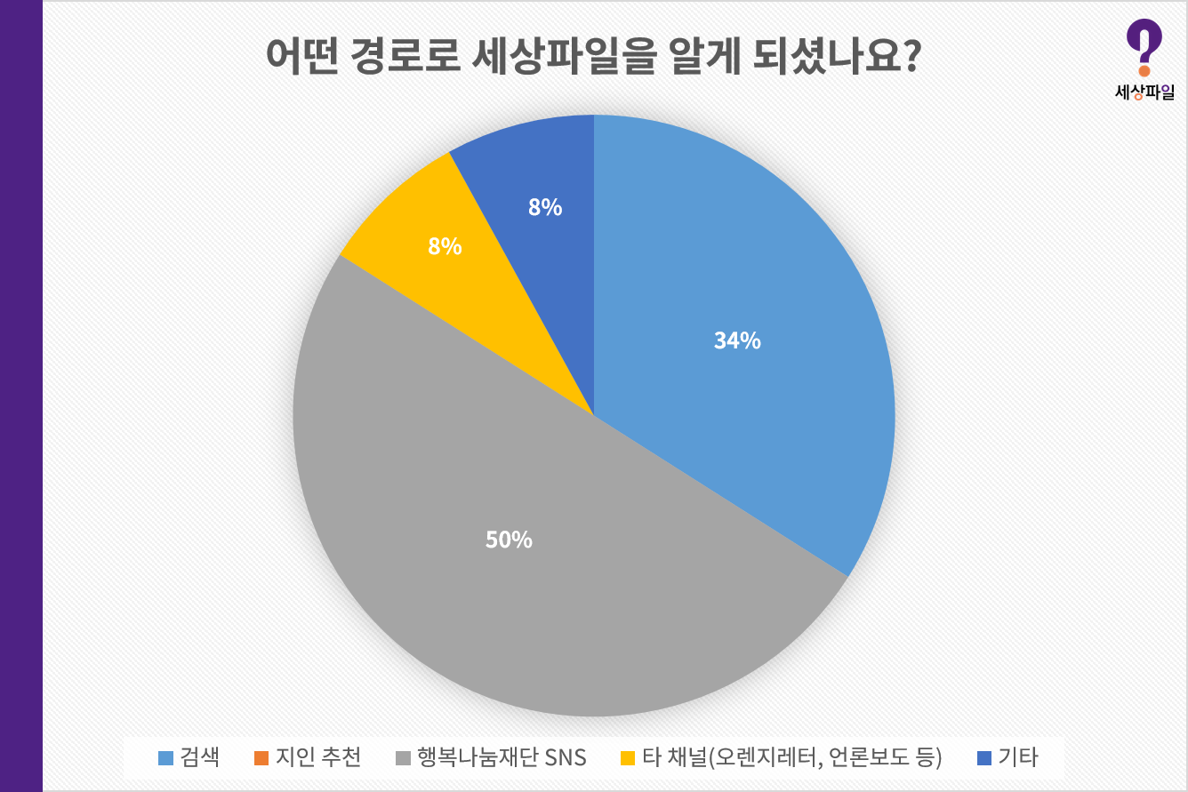 특히 응답자의 50%가 ‘행복나눔재단 SNS’를 통해, 그리고 무려 33%가 ‘직접 검색’을 통해 유입되었다는 점은 세상파일이 쌓아 온 아카이빙이 업계 내에서 믿을 만한 자본으로 자리잡았음을 보여주죠.