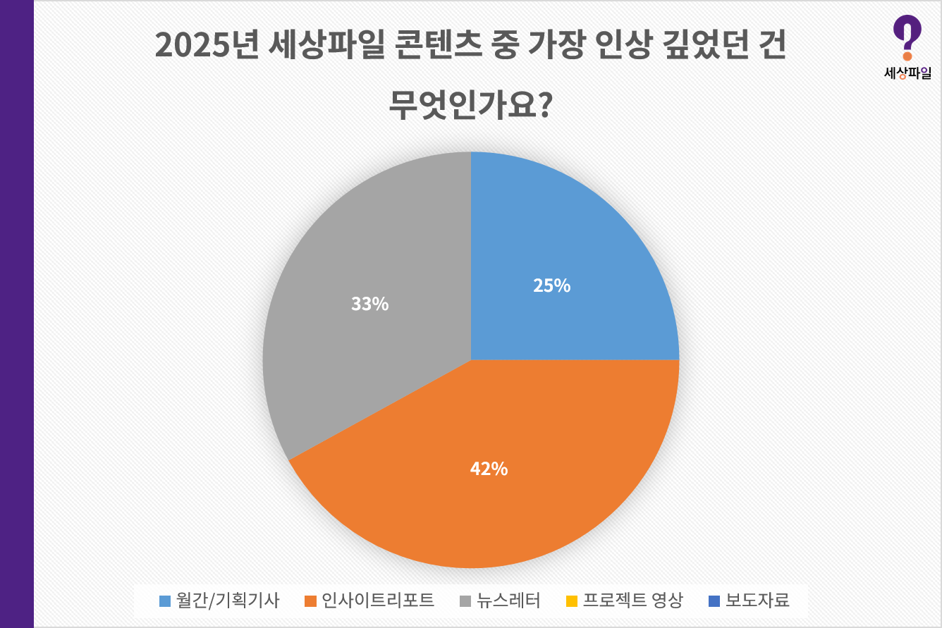 독자들이 2025년 가장 인상 깊었던 콘텐츠 유형으로 꼽은 것은 ‘인사이트리포트(42%)’와 ‘뉴스레터(33%)’였어요. (> 세상파일 뉴스레터 구독하기)